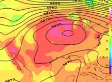 The heat wave was caused by a large high pressure system that traversed across the midwest United States. This system was consistently producing maximum temperatures in the 90's °F (32-38 °C) during the day with minimum temperatures still remaining as high as the 80s °F (27-32 °C) at night, which is abnormal for midwest summer months.[7] The system also brought extremely low wind speeds, along with high humidity. In the MERRA-2 and the ERAI meteorological reanalyses, the system (see figure) moved eastward, becoming indistinguishable by July 18.