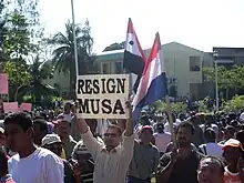 On January 14, 2005 Said Musa's administration announced its budget for 2005-2006.[1] The budget included major tax increases on a variety of businesses and commodities. It included an 11% increase in the real estate sales tax, a five percent tax increase for financial institutions, an eight percent tax increase on tobacco, and a 100% tax increase on rum. The government claims that these tax increases were comparable to increases instituted in 1998 under the United Democratic Party (UDP). However, after years of popular frustration at alleged financial mismanagement and corruption by the People's United Party (PUP), the new budget sparked condemnation from local interest groups[2] and protests at the National Assembly building on January 14, with demonstrations continued throughout the following week. The main protesters were the National Trade Union Congress of Belize and the Belize Chamber of Commerce.