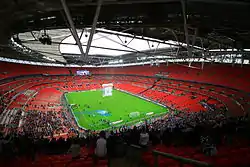 The match kicked off around 3 p.m. on 26 May 2008 at Wembley Stadium in front of a crowd of 35,715.[18] Both sides had early periods of possession but neither could break the deadlock on a wet surface. Midway through the first half, a Chris Dagnall strike from distance took a deflection and passed just wide of the Stockport County goal. From the ensuing corner, Rory McArdle headed the ball in from close range at the near post to make it 1–0 to Stockport County in the 24th minute. Anthony Pilkington then struck a free kick narrowly wide of Rochdale's goal. In the 34th minute, Tommy Rowe played in a cross from a short corner which Nathan Stanton diverted into his own net for an own goal, to level the score and the sides went in at half-time at 1–1.[19]