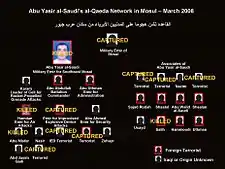 On June 27, the U.S. military announced that it had killed Abu Khalaf, the leader of Al-Qaeda in Mosul. He was shot dead by American forces during a raid on a building in Mosul.[35] Al-Qaeda suffered perhaps its greatest blow when American soldiers killed Khalaf, the "emir of Mosul". He had been a close associate of Abu Musab al-Zarqawi, the most notorious leader of Al-Qaeda in Iraq, who was killed in an airstrike two years before. An aide wearing a suicide vest died with the emir, as did a woman who tried to pull the detonator on his vest.[36]