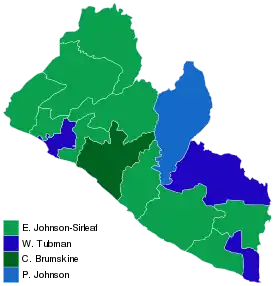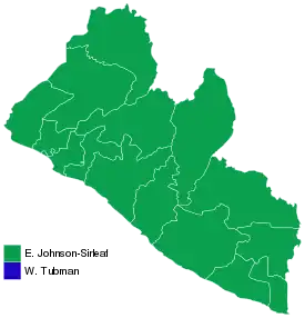 In the first round of the presidential election, incumbent President Ellen Johnson Sirleaf of the Unity Party led the presidential field with 43.9% of the vote, followed by Congress for Democratic Change candidate Winston Tubman with 32.7%. As no candidate received an absolute majority, Sirleaf and Tubman stood in a run-off election held on 8 November 2011. Tubman alleged that the first round had been rigged in Sirleaf's favor and called on his supporters to boycott the run-off. The Electoral Institute for Sustainable Democracy in Africa reported a turnout of 61% as compared to the 74.9% turnout in the first round.[2] The NEC declared Sirleaf the winner of the run-off on 15 November 2011 with 90.7% of the vote.[3]