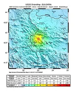 The 2012 Pernik earthquake was a 5.6 Mw magnitude earthquake, which struck 24 km (15 miles) west of Bulgaria's capital Sofia and 9 km (6 miles) north-northwest of the provincial center Pernik on 22 May 2012 at 3:00 am local time (00:00 UTC) at a depth of 9.4 kilometers (5.8 mi).[2]