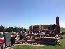 Since the tornado remained over mostly open terrain, damage was relatively light – although still significant in isolated locations – in comparison to its extreme intensity. Surveys from the National Weather Service revealed that structures in its path sustained EF3-level damage at most.[46] The Oklahoma City West Livestock Market was described as a "war zone," sustaining extensive damage. Several large steel-frame warehouse type buildings were destroyed at that location. Multiple large brick buildings at the nearby Canadian Valley Technology Center were heavily damaged or destroyed, and a large metal wind turbine prop blade was thrown 100 yards (91 m) into the side of a daycare building on the property. Damage totals at that location alone were estimated at up to $40 million.[47][48][49] One farmstead, consisting of a large barn, a cattle barn, three machine sheds, granaries and the owner's home, was also completely destroyed.[50] Several other rural homes were destroyed, and large amounts of gravel was blown off of gravel roads in the area, with only the dirt underneath left at some locations.[49] Several large metal electrical transmission poles were downed, trees were snapped and defoliated, and multiple vehicles were tossed from roadways in the area. At least 29 buildings and 40 vehicles were damaged or destroyed by the tornado, with repairs in the El Reno area expected to take at least a year.[49][51]