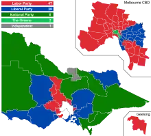 The election marked the first time since 1955 that a Victorian state government had been defeated after only one parliamentary term. Furthermore, the Nationals were reduced to a total of ten seats in the Legislative Assembly and Legislative Council, one short of official status in the legislature.[1] Following the election, both Napthine and Ryan resigned as leaders of the Liberal and National parties, respectively.
