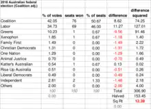 - ↑ Mackerras pendulum for the 2016 Australian federal election based on Green, Antony. "Blog: 2016 election pendulum". ABC News. Australia. Archived from the original on 31 May 2016. – O'Connor and Durack in WA not included for Labor majority calculation but are included for Coalition loss of majority calculation. Fairfax in QLD is considered a Coalition seat for Coalition loss of majority calculation.