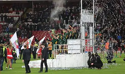Australia celebrate beating the New Zealand at Anfield in the final.