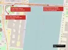 At 14:40 local time on 22 March 2017,[6] a grey Hyundai Tucson,[7][8][9][10] hired in Birmingham,[7] was driven at up to 76 miles per hour (122 km/h)[11] into pedestrians along the pavement on the south side of Westminster Bridge and Bridge Street, causing multiple casualties.[12][13] One of the victims, a Romanian tourist, was thrown by the car's impact over the parapet of the bridge into the River Thames below. Having been knocked unconscious and sustained severe injuries from the fall, she was rescued by the crew of a river cruise and brought aboard a London Fire Brigade boat.[8] She later died in hospital from her injuries.[14]