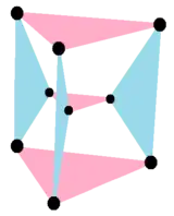 The 2{4}3 with 6 vertices in blue and red connected by 9 2-edges as a complete bipartite graph.