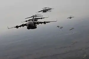 By 1968 regular air force military airlift squadrons were operating the Lockheed C-141 Starlifter, while the reserves still flew the obsolete Douglas C-124 Globemaster II. As the Globemaster was retired, Air Force Reserve formed associate units, initially with the C-141. In this program reserve units flew and maintained aircraft owned by an associated regular unit.[26] In September 1970, the squadron was redesignated the 701st Military Airlift Squadron and activated at Charleston Air Force Base, South Carolina, where it was assigned to the 943d Military Airlift Group as an associate of the 437th Military Airlift Wing. Two years later, the 315th Military Airlift Wing replaced the 943d Group as the reserve command for Charleston airlift units. The squadron assisted with the redeployment of U.S. Army and Marine Corps personnel from Grenada following Operation Urgent Fury in 1983. In 1984 and 1985, the squadron helped deploy U.S. personnel throughout Central and South America from Howard Air Force Base, Panama in support of Operations Volant Oak. From 1992, it has been involved in various humanitarian missions including missions to Washington, DC and New York City in aftermath of the 9/11 attacks on the US by terrorists. The squadron airlifted NASA's Mars Odyssey spacecraft from Buckley Air Force Base, Colorado to Cape Canaveral, Florida for its launch to orbit Mars on 4 January 2001. It supported relief missions for damage caused by Hurricane Katrina in August 2005 and Hurricane Ike in September 2008.[1]