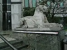 The building was constructed with two stone lion sculptures, nicknamed Patience and Perseverance, first installed at the original front entrance. The 9,000 lb (4,100 kg) lions have been moved three times in 1991 to the new police headquarters at 120 Marconi Boulevard, in 2012 back to the original building, and in 2017 back to the new headquarters. The first move was prompted by the police offices moving, while the second was part of improving 77 North Front Street during its restoration and expansion. Columbus police were upset with the move, even though the new building was supposed to gain new sculptures. The police union backed the officers, and secured a donation from contractors to move the lion sculptures back to the new headquarters in 2017, where they remain today.[6][7]