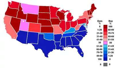 Percentage of members from each party by state at the opening of the 80th Congress, ranging from dark blue (most Democratic) to dark red (most Republican).