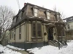 The house is set in Portland's West End neighborhood, just south of Congress Street on the east side of Walker Street. It is a 1+12-story wood-framed structure, with a mansard roof providing a full second story. The roof is finished with diamond-cut slate shingles, in bands colored beige and red. The building is finished in wooden clapboards, with corner pilasters, and a dentillated and paneled entablature with paired brackets below the roofline. The front facade is symmetrical, with projecting polygonal bays on either side of the entrance, and gabled dormers in the roof line with decorate scrollwork in the gable peaks. The main entrance is sheltered by a bracketed hood. A rear ell, built with sympathetic styling, houses modern amenities, while the main house interior retains original woodwork and finishes, including a remarkable set of trompe-l'œil frescos in its central hall and stairwell.[2]