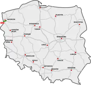 PolandWest Pomeranian VoivodeshipGmina Kołbaskowo00.0Kołbaskowo / Pomellen former border crossing A 11 / E28BerlinSouthwestern endpoint of motorway, route continues as German motorway A 11 towards Berlin