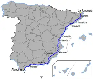 The Autovía A-7 (also called Autovia del Mediterráneo) is a Spanish autovía (toll-free limited-access highway) which starts in La Jonquera, near the French frontier and ends in Algeciras. It was finally finished in late 2015 upon completion of sections west of Almeria and around Motril, is a free alternate route to the tolled Autopista AP-7, and is the longest national motorway in Europe.