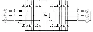 There is the alternative option of indirect energy conversion by employing the Indirect Matrix Converter (Fig. 5) or the Sparse matrix converter which was invented by Prof. Johann W. Kolar from the ETH Zurich. As with the DC-link based VSI and CSI controllers (Fig. 2 and Fig. 3), separate stages are provided for voltage and current conversion, but the DC-link has no intermediate storage element. Generally, by employing matrix converters, the storage element in the DC-link is eliminated at the cost of a larger number of semiconductors. Matrix converters are often seen as a future concept for variable speed drives technology, but despite intensive research over the decades they have until now only achieved low industrial penetration. However, citing recent availability of low-cost, high performance semiconductors, one larger drive manufacturer has over past few years been actively promoting matrix converters.[11][12]