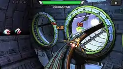 Players control a weaponized space ship by swiping one finger on the touchscreen to maneuver the ship and perform barrel rolls. Each ship has two methods of eliminating enemies: "Primary Weapon" (a pair of lasers that fire automatically when the ship's crosshairs are lined up with an enemy), and a "Secondary Weapon" (activated by tapping the screen, and requiring time to recharge). Neutralizing targets in quick succession builds a combo multiplier that rewards the player with bonus points. Additionally, chains of cubes appear on the battlefield, and if all are collected, they too add bonus points, adding to the player's total score.