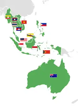 The AFF was established in Jakarta on 31 January 1984 during an informal meeting of representatives of six member states of ASEAN; Brunei, Indonesia, Malaysia, Singapore, Philippines and Thailand. The idea of founding the federation came from the initial meeting of founding the sub-continental football association in Bangkok in 1982 that was attended by Hamzah Abu Samah, Peter Velappan, Hans Pandelaki, Fernando G. Alvarez, Pisit Ngampanich, Teo Chong Tee and Yap Boon Chuan.[3] Other nations that have joined the federation since have been Cambodia, Laos, Myanmar and Vietnam (all in 1996),[1] East Timor in 2004, and Australia in 2013.[4]