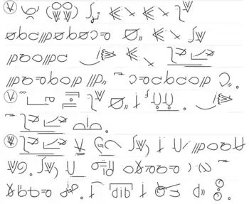 ASLwrite (ASL: ) is a writing system that developed from si5s.[1] It was created to be an open-source, continuously developing orthography for American Sign Language (ASL), trying to capture the nuances of ASL's features. ASLwrite is only used by a handful of people, primarily revolving around discussions happening on Facebook[2] and, previously, Google Groups.[3] ASLwrite has been used for comic strips[4][5] and posters.[6]