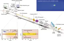 The proton bunches for AWAKE are extracted from the CERN SPS and are transported through an ~800-meter beam-line to the 10-meter long vapor source of AWAKE. The electron witness bunches are injected behind the proton bunch.[4] To detect acceleration of the injected electrons, a dipole magnet is installed after the vapor, bending their path. The larger the electron's energy, the smaller curvature of its path. A scintillation screen then detects accelerated electrons.[2]