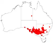 The plant is distributed widely throughout semi-arid parts of south eastern Australia from around Yalata in the west to around Bendigo in Victoria in the east and as far north as Nymagee in New South Wales where it is found growing in many different soil types and often part of mallee communities.[3]