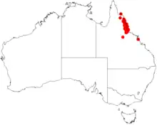 It is endemic to north eastern parts of Queensland from as far north as Cooktown to the eastern area of the Atherton Tableland with a separate disjunct southern population located in the Paluma Range to the north west of Townsville. It is usually situated along coastal plains and on steep mountains often to around 600 to 900 m (2,000 to 3,000 ft) in height where it is a pioneer or canopy species as part of rainforest communities.[1]
