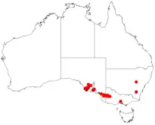 It has a disjunct distribution through parts of south eastern South Australia and western Victoria. It is found on the southern tip of the Eyre Peninsula and Yorke Peninsula from around Curramulka and near Bordertown extending eastwards as far as to Nhill in western Victoria.[3] It is often found as part of woodland to open forest communities and grows in sandy alkaline soils as well as neutral yellow duplex to red porous loamy soils and grey cracking clay soils.[4]