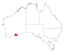 It is endemic to an area along the south coast of the Goldfields-Esperance region of Western Australia where it is found along the edges of salt lakes and marshes and seasonally wet swamp areas growing in sandy-clay-loam soils.[1] It is often part of tall myrtale shrubland and mallee woodland communities.[2]