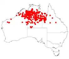 The plant will grown in red sand, loam and clay soils, it is found on plains and stony hills.[1] It is found mostly in tropical areas in the Kimberley region of Western Australia, the Northern Territory and northern Queensland. It is usually part of in open Eucalypt and Acacia woodland, low scrub or spinifex grassland.[2]