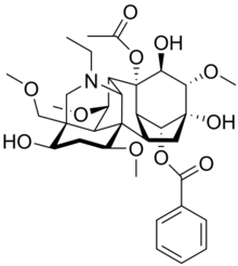 Like many other alkaloids, the basic nitrogen atom in one of the six-membered ring structure of aconitine can easily form salts and ions, giving it affinity for both polar and lipophilic structures (such as cell membranes and receptors) and making it possible for the molecule to pass the blood–brain barrier.[5] The acetoxyl group at the c8 position can readily be replaced by a methoxy group, by heating aconitine in methanol, to produce a 8-deacetyl-8-O-methyl derivatives.[6] If aconitine is heated in its dry state, it undergoes a pyrolysis to form pyroaconitine ((1α,3α,6α,14α,16β)-20-ethyl-3,13-dihydroxy-1,6,16-trimethoxy-4-(methoxymethyl)-15-oxoaconitan-14-yl benzoate) with the chemical formula C32H43NO9.[7][8]