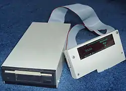 The first disc interface to be announced for the Electron was Pace's Le Box in 1984, offering a single-sided 100 KB floppy drive controlled by the 8271 controller and accessed using the Amcom Disc Filing System, with pricing at £299 plus VAT including the drive or around £199 without. The unit also provided eight sideways ROM sockets and was intended to sit under the Electron itself.[97] The unit was connected via cabling to the expansion edge connector and included its own power supply, and other drives including switchable 40/80 track drives offering up to 400 KB capacity were dealer-supplied options.[98] Although the product was meant to be on sale at the Acorn User Show in August 1984,[97] and had been advertised,[99] it was "discontinued" in early 1985 before getting to market, with a Pace representative indicating that prohibitive pricing of the 8271 chips (each at "over £80 at times") had left the company considering a re-launch of the product should the pricing situation become more favourable.[100]