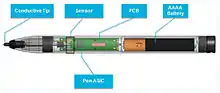 An active pen (also referred to as active stylus) is an input device that includes electronic components and allows users to write directly onto the display of a computing device such as a smartphone, tablet computer or ultrabook.[1] The active pen marketplace has long been dominated by N-trig[2] and Wacom,[3] but newer firms Atmel[4] and Synaptics[5] also offer active pen designs.