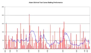 His strike rate is amongst the highest in the history of both ODI and Test cricket; his 57 ball century against England at Perth in December 2006 is the fourth-fastest century in all Test cricket.[4] He was the first player to have hit 100 sixes in Test cricket.[5] His 17 Test centuries and 16 in ODIs are both second only to Sangakkara by a wicket-keeper. He holds the unique record of scoring at least 50 runs in successive World Cup finals (in 1999, 2003 and 2007). His 149 off 101 balls against Sri Lanka in the 2007 World Cup final is rated one of the greatest World Cup innings of all time.[6] He is one of only three players to have won three World Cup titles.[7]