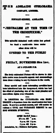 - ↑ "The Adelaide Cyclorama Company, Limited". The Advertiser. Adelaide: National Library of Australia. 28 November 1890. p. 2. Retrieved 21 March 2015.