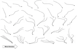 Spider ballooning structures. Black, thick points represent the spider's body. Black lines represent ballooning threads.[71]