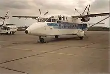 Air UK was the name of the new airline resulting from the merger of BIA and Air Anglia.[4] (BIA had already absorbed Exeter-based Air Westward in March 1979).[3][16] Cardiff-based Air Wales had become part of Air Anglia in June of that year.[2][17]) It was incorporated on 1 January 1980.[2][3] Operations commenced on 16 January 1980.[18] At the time of its inception, Air UK was the largest regional airline in the UK and the country's third-largest scheduled carrier.[2][3][19] It had a staff of 1,700, carried more than 1m, mainly scheduled, passengers annually and had a fleet of 40 aircraft,[20] consisting of six jets (four ex-BIA BAC One-Eleven 400s and two ex-Air Anglia F-28 4000 series Fellowships) and 34 turboprops (including eighteen ex-BIA Handley Page Dart Heralds, ten ex-Air Anglia Fokker F-27 100/200 series Friendships and six Embraer 110 Bandeirantes originally part of the BIA, Air Wales and Air Westward fleets). Apart from the four One-Eleven 400s, which were predominantly operated on charter flights,[20] all the other aircraft were part of Air UK's scheduled service fleet.