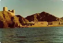 "Muscat" means "anchorage".[3] True to its name, Old Muscat is a natural port in a strategic location between the Persian Gulf and the Indian Ocean. It lies on the coast of the Gulf of Oman on a bay about 700 metres (2,300 ft) long, protected from the sea by a rocky island.[4][lower-alpha 1] The port is surrounded by mountains, making it difficult to access from the landward side.[3] Muscat may have been described by the geographer Ptolemy in the 2nd century, who noted a "concealed harbor" in the region.[3]