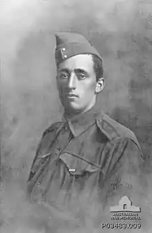 In 1914 he was working as a clerk, but he enlisted in Melbourne on 22 August 1914; it was the same day that he played his last match for Collingwood.[9] He was the first Collingwood footballer to enlist.[10] He served as a private in B Company of the 6th Battalion, First AIF, and embarked on 19 October 1914, aboard HMAT Hororata, for service overseas.