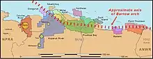 The Barrow Arch is a hinge line fault zone that marks a northern high in the ANS. The Barrow Arch runs east to west along the length of the basin and separates the ANS foreland basin from the Canadian Basin to the north. Sediments have a subtle dip of 3°-6° southward into the Colville trough.[1]