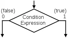 Decision Box: A diamond indicates that the stated condition/expression is to be tested and the exit path is to be chosen accordingly. The condition expression contains one or more inputs to the FSM (Finite State Machine). An ASM condition check, indicated by a diamond with one input and two outputs (for true and false), is used to conditionally transfer between two State Boxes, to another Decision Box, or to a Conditional Output Box. The decision box contains the stated condition expression to be tested, the expression contains one or more inputs of the FSM.
