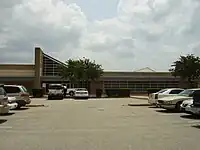 Brutalist building with a sign reading "Alief Elsik High School"