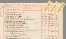 The layout of the catalogue has always been tabular.[9] Ptolemy writes explicitly that the coordinates are given as (ecliptical) "longitudes" and "latitudes", which are given in columns, so this has probably always been the case. It is significant that Ptolemy chooses the ecliptical coordinate system because of his knowledge of precession, which distinguishes him from all his predecessors. Hipparchus' celestial globe had an ecliptic drawn in, but the coordinates were equatorial.[10] Since Hipparchus' star catalogue has not survived in its original form, but was absorbed into the Almagest star catalogue (and heavily revised in the 265 years in between),[11][10] the Almagest star catalogue is the oldest one in which complete tables of coordinates and magnitudes have come down to us.