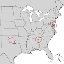 In 2002, the three populations were recognized as subspecies and given the names Alnus maritima subsp. oklahomensis, Alnus maritima subsp. georgiensis, and Alnus maritima subsp. maritima, respectively.[3] While some believe that subspecies maritima is the oldest of the three subspecies and that the other two disjunct populations resulted from some form of long distance dispersal, evidence from morphometric and phylogeographic studies indicates that the Oklahoma population (subsp. oklahomensis) is in fact the most ancestral and that the species probably had a wide, continuous distribution across the United States in the past.[3][4]