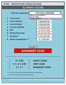This overstates the predictive ability of the Altman Z-score, however. Scholars have long criticized the Altman Z-score for being “largely descriptive statements devoid of predictive content ... Altman demonstrates that failed and non-failed firms have dissimilar ratios, not that ratios have predictive power. But the crucial problem is to make an inference in the reverse direction, i.e., from ratios to failures.”[3] From about 1985 onwards, the Z-scores gained wide acceptance by auditors, management accountants, courts, and database systems used for loan evaluation (Eidleman). The formula's approach has been used in a variety of contexts and countries, although it was designed originally for publicly held manufacturing companies with assets of more than $1 million. Later variations by Altman were designed to be applicable to privately held companies (the Altman Z'-score) and non-manufacturing companies (the Altman Z"-score).