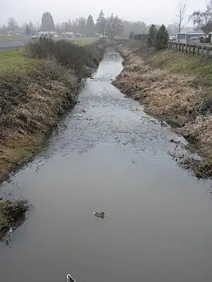 Amazon Creek's headwaters are located in Eugene's southeast hills near Spencer Butte. The creek bed has been altered from the foot of Spencer Butte so it flows north from Martin Street through Amazon Park in a channel. At 24th street it enters a 1.75 mile concrete channel. The stream travels north to 18th Avenue, turning west near High Street and continuing into the levee channel (diversion canal) near the Lane County Fairgrounds at Jefferson Street.[3] It continues west to Fern Ridge Reservoir and the Long Tom River.[1] It collects water from 21 square miles of urban landscapes and storm drains, providing flood control, wildlife habitat, and recreation.[4]