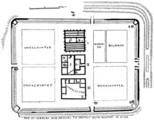 The fort consisted of a rectangular enclosure measuring approximately 91 by 128 metres (300 by 420 ft), and covering an area of almost 1.2 hectares (3 acres).[19] The fort had towers at each corner,[22] and was enclosed by a 1.2-metre (4 ft) thick wall of roughly coursed stone. A clay ramp backed the wall from the inside, and a ditch ran around the outside.[23]