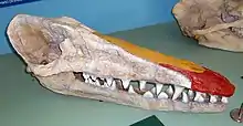 The Kuldana Formation is constrained to sometime during the Lutetian stage of the Early Eocene,[3] and the remains may date to 48–47 million years ago.[4] The holotype specimen, HGSP 18507, is a partial skeleton initially discovered preserving an incomplete skull (missing the snout), some elements of the vertebral column and ribs, as well as portions of the fore- and hind-limb. Other specimens initially found were HGSP 18473 (a second premolar), HGSP 18497 (a third premolar), HGSP 18472 (a tail vertebra), and HGSP 18476 (lower portion of a femur). The holotype was found in a silt and mudstone bed over a 1.8 m2 (19 sq ft) area.[2] Further excavation recovered most of the holotype's skeleton—most notably the hip, sacrum, and most of ribcage and thoracolumbar series (the spine excluding the neck, sacrum, and tail). These left the holotype about 80% complete by 2002, making it the most completely known cetacean from the time period.[5] In 2009, some more elements of the holotype's jawbone were identified from a then-recently prepared matrix block.[3]