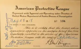 The American Protective League (1917-1919) was an organization of private citizens sponsored by the United States Department of Justice that worked with federal law enforcement agencies during the World War I era. Its mission was to identify suspected German sympathizers and to counteract the activities of radicals, anarchists, anti-war activists, and left-wing labor and political organizations. At its zenith, the APL claimed 250,000 members in 600 cities.