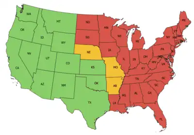 The game is currently set in a condensed 1:20-scaled version of the entire Western Contiguous and part of the South Central and Midwestern regions in the United States, expanded periodically by the developer through downloadable content. It currently features depictions of the U.S. states of California, Nevada, and Arizona, with New Mexico, Oregon, Washington, Utah, Idaho, Colorado, Wyoming, Montana, Texas, Oklahoma and Kansas available as DLCs.[20] The game features 204 visitable cities, including most state capitals and major cities, as well as many thousands of miles worth of in-game roads.[20] Currently, the player may travel as far north as Bellingham, Washington, as far south as Brownsville, Texas, as far west as Eureka, California, and as far east as Beaumont, Texas, assuming the player has all the states available to them. SCS have stated that most future map expansions, if not all, will be at additional cost.[20] The modding community for American Truck Simulator have also created their own map extensions. The most popular of these extensions include cities in each state, Mexico, and Canada, though the majority of these maps, with some exceptions, are generally not as dense with roads as the base game nor regarded by the community as high quality or detailed. Some modded maps redo older sections of the map with their own areas, regarded as higher quality than the vanilla game. These old areas are generally considered to be out-of-date by the community, with lower design standards than SCS Software's map content with the exception of northern California and Las Vegas as of version 1.44.[21]