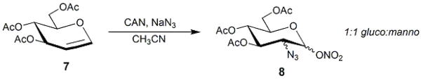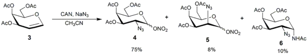 Glycals are cyclic enol ether derivatives of monosaccharides, having a double bond between carbon atoms 1 and 2 of the ring. N-functionalized of glycals at the C2 position, combined with glycosidic bond formation at C1 is a common strategy for the synthesis of amino sugars. This can be achieved using azides with subsequent reduction yielding the amino sugar.[1] One advantage of introducing azide moiety at C-2 lies in its non-participatory ability, which could serve as the basis of stereoselective synthesis of 1.2-cis-glycosidic linkage.