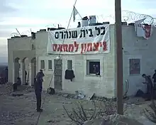 Amona was founded in 1995 on private Palestinian land[7] by young settlers from Ofra who thought it was getting too urbanized for their taste.[8] It was one of the first outposts. Amona was constructed on property the Palestinians of Silwad used to cultivate and grow crops on, land that was stolen from them by Ofra teenagers.[9] According to documents of the Israeli Civil Administration, the land had been cultivated and worked by local Palestinians until the outpost was erected, though the settlers claim that the site was a rocky hilltop before.[10] Yesh Din states that Amona is built on the land of three Palestinian villages, Silwad, Ein Yabrud and Taybeh.[11] Amira Hass, interviewing one of the Silwad petitioners, Abed al Rahman Ashur, writes: